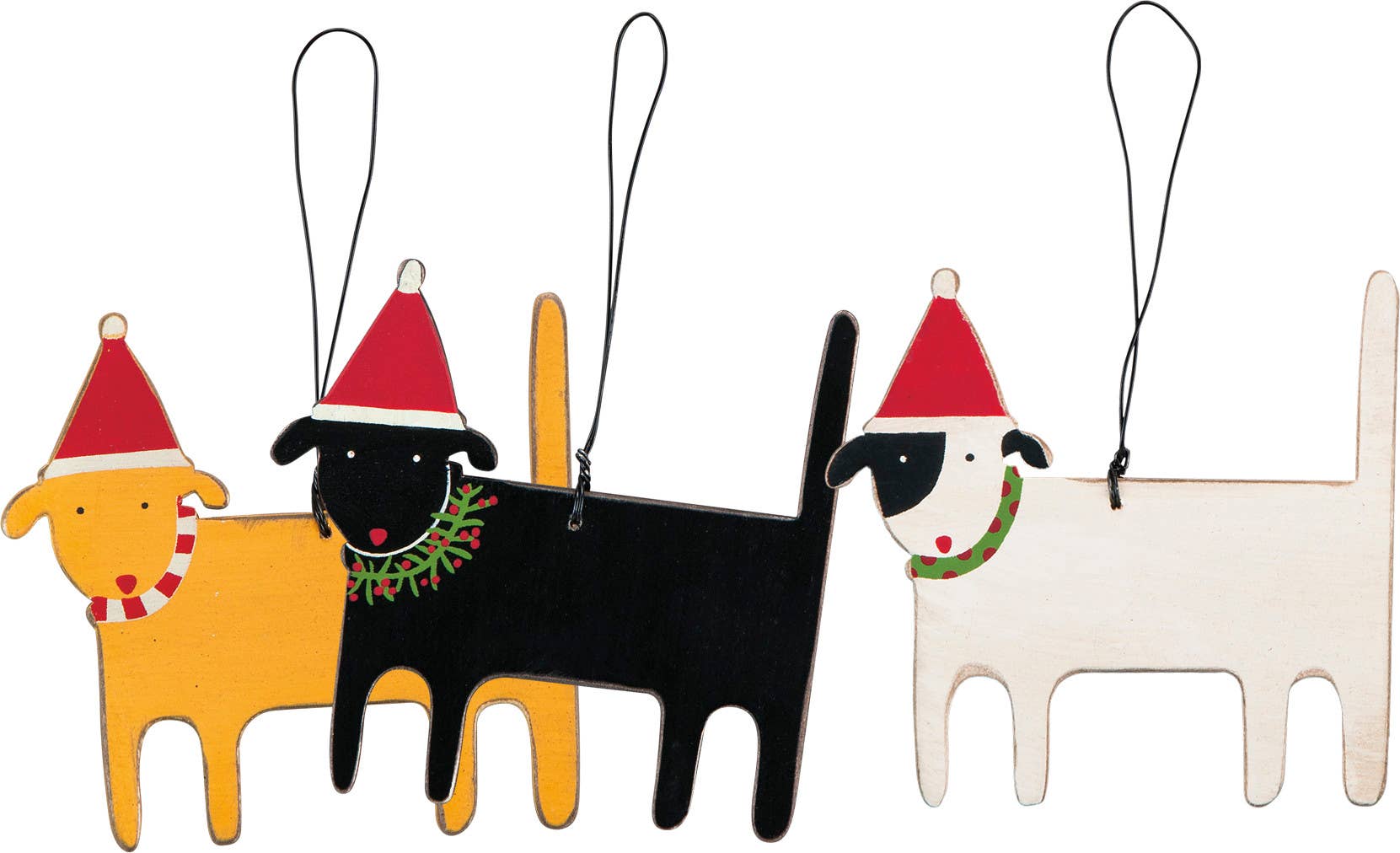 A set of three wooden dog-shaped Christmas ornaments from our Christmas Collection come in various colors featuring Santa hat and collar details. Our Christmas Dogs ornament set contains top wire loops for easy hanging.
