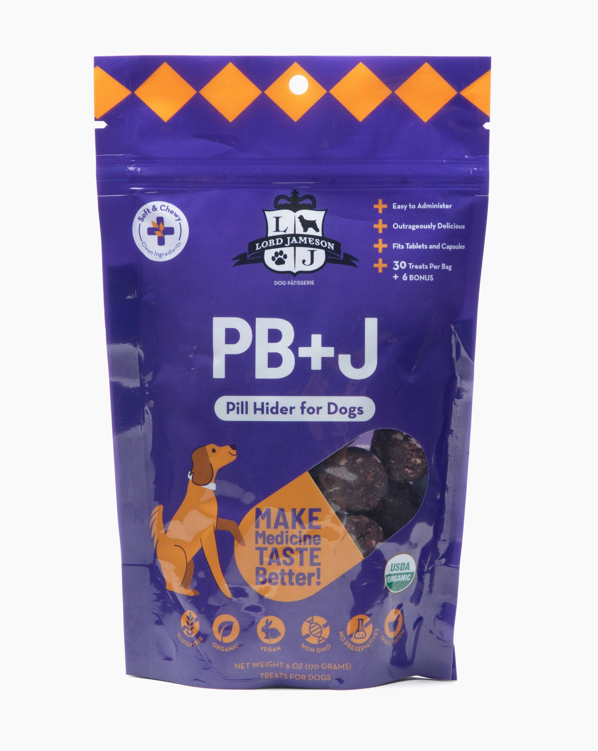 Make medicine taste better with our PB+J flavored Pill Hider Dog Treat. Finally, a CLEAN way to make administering your dog's medications an easy and tail-wagging experience! Just stick the pill or capsule inside one of our pill hider treats, pinch the treat closed to form a soft moldable pill hider, and feed to your dog! Watch your dog's tail wag as they beg for more!